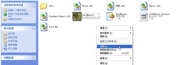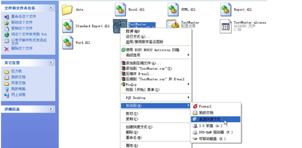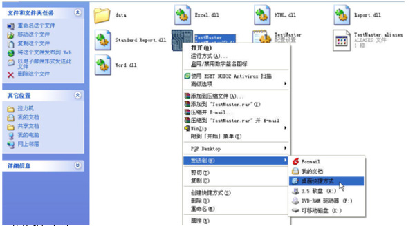 5.刪除桌面上的快捷方式”TestMater”,然后為新版本軟件制作一個(gè)新的快捷方式:鼠標(biāo)右鍵單擊新版本軟件所在文件夾中的”TestMaster”程序,再鼠標(biāo)左鍵單擊下圖所示的”桌面快捷方式”選項(xiàng),桌面上就會有了一個(gè)新版本軟件的快捷方式: