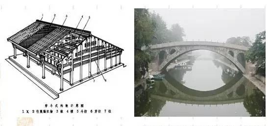 左:傳統(tǒng)具有柱薄弱點、梁的木質(zhì)房屋結(jié)構(gòu)覆蓋範圍;右:趙州橋。