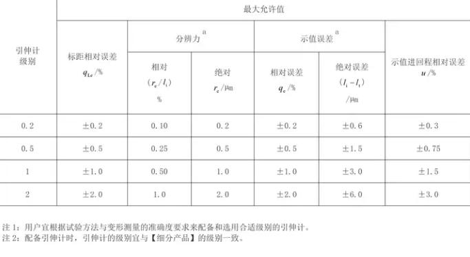 引伸計標距相對誤差:引伸計可以有一個或多個標距。各級別的引伸計標距相對誤差的最大允許值應符合規(guī)定前景。